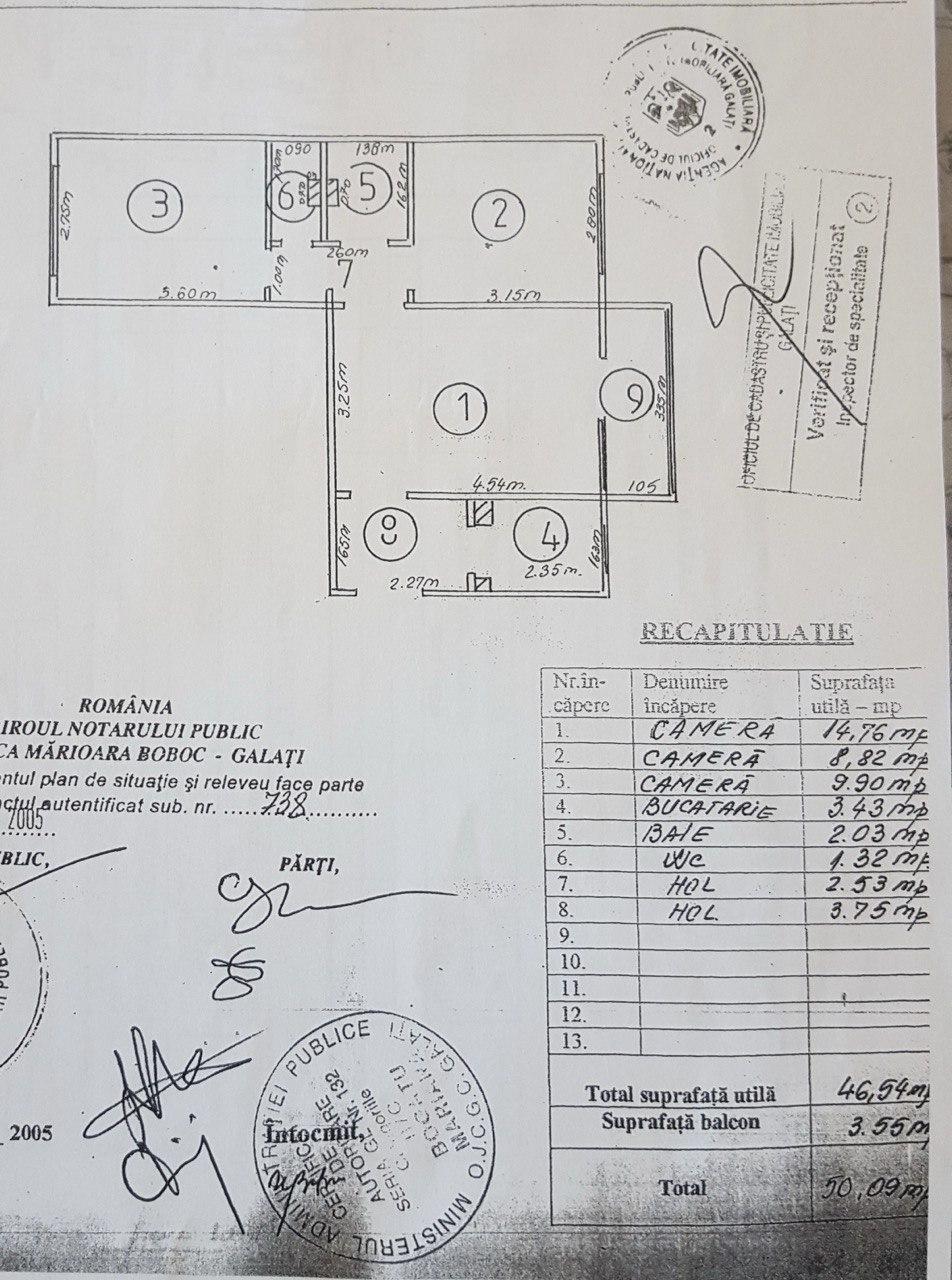 Apartamentul are o suprafata totala de 50.09 mp, din care 2.94 mp balcon, situat in Galati, zona Micro 40, Bulevardul MILCOV, nr. 46, bl. M2, Et. 1. (In spate la Asia Shop).