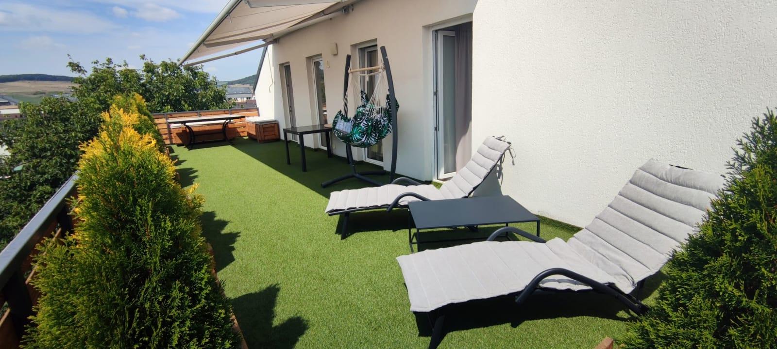 De vanzare un penthouse modern, cu 3 camere, aflat într-un bloc nou, cu 3 etaje din Ama Residence, cartierul Unirii. Dimensiunea imobilului este de 75mp parter +23mp-etaj + 45mp terasă. Compus dintr-un living spațios , inalt si aerisit open space cu bucataria, camara , un dormitor matrimonial cu dressing,un dormitor de oaspeti la etaj + spatiu de depozitare ( cu posibilitate de amenajare o baie mica ) baie , si terasă panoramică pe suprafata apartamentului, cu acces către toate camerele. Imobilul beneficiază de 1 loc de parcare (care este inclus in pretul apartamentului ). Apartamentul se vinde complet mobilat si utilat dupa cum se vede in fotografii.
