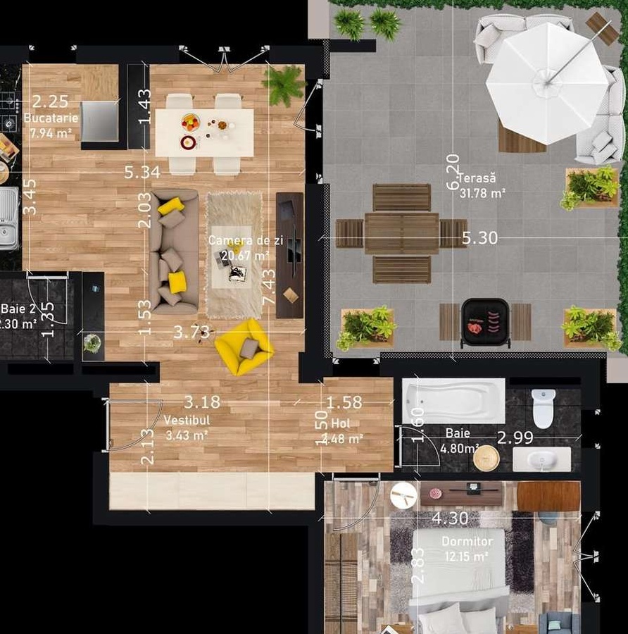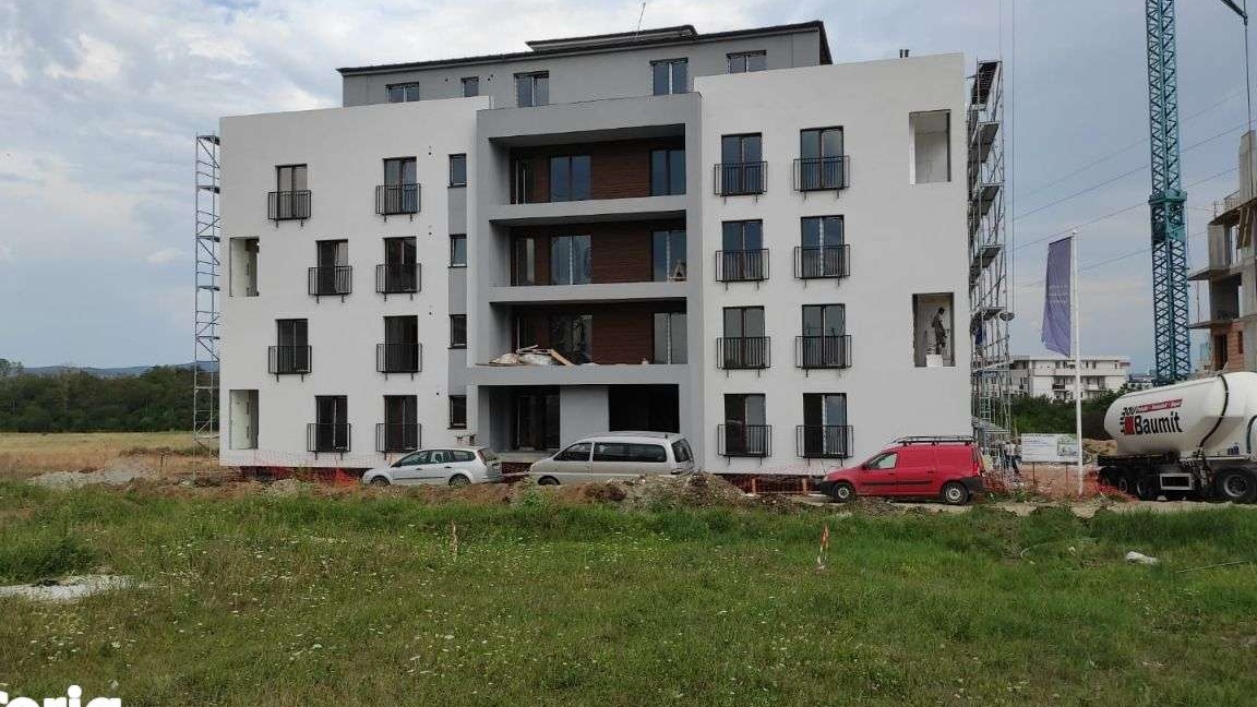 Va oferim spre vanzare un apartament cu 2 camere bine compartimentate, situat in ansamblul rezidential Neppendorf din zona Turnisor. Ansamblul este alcatuit din 7 blocuri de apartamente cu 2 si 3 camere. Blocurile se construiesc in regim de inaltime P+3E+ER, cu dotari complementare precum lift, garaj, boxe, numeroase spatii de parcare si loc de joaca pentru copii. Comision 0 la achizitionare pentru acest apartament de vanzare.Apartamentul este situat la etajul retras intr-un imobil nou cu 4 etaje si are o suprafata utila de 53.77 mp. Separat de acest spatiu, apartamentul dispune de o terasa mare de 32 mp.Apartamentul este alcatuit dintr-un hol de acces, un living cu bucatarie deschisa, un dormitor, o baie cu geam si o terasa de 32 mp. Avantaje apartament: - ansamblu rezidential nou, blocuri cu lift, boxe si garaj - boxa la subsol inclusa in pret - locuri de joaca pentru copii - apartamente izolate termic si fonic cu materiale specifice - caramida Cemacon (confort termic si acustic ridicat, protectie ridicata la incendii, reduce riscul aparitiei igrasiei si mucegaiului) - incalzire in pardoseala - locatie buna, aproape de zona de Vest a orasului si de Aeroportul Sibiu - priveliste panoramica asupra orasului - adapost A.L.A. - cai de acces asfaltate si iluminate - logii finisate la cheie - clasa energetica A Stadiul si data de predare: Imobilul se va preda la stadiul de alb, cu aproximație, in August 2023 . Stadiul de alb cuprinde: centrala termica Vaillant si incalzire in pardoseala, prize si intrerupatoare pentru instalatia electrica, geamuri termopan cu 7 camere si 3 foi de sticla, usa la intrare si peretii finisati cu o mana de lavabila. La cererea clientului, apartamentele pot fi finisate la cheie de catre dezvoltatorul imobiliar, contra cost. In pretul acestui apartament de vanzare in Sibiu este inclus si un loc de parcare. . Pret: 93.000 Euro
