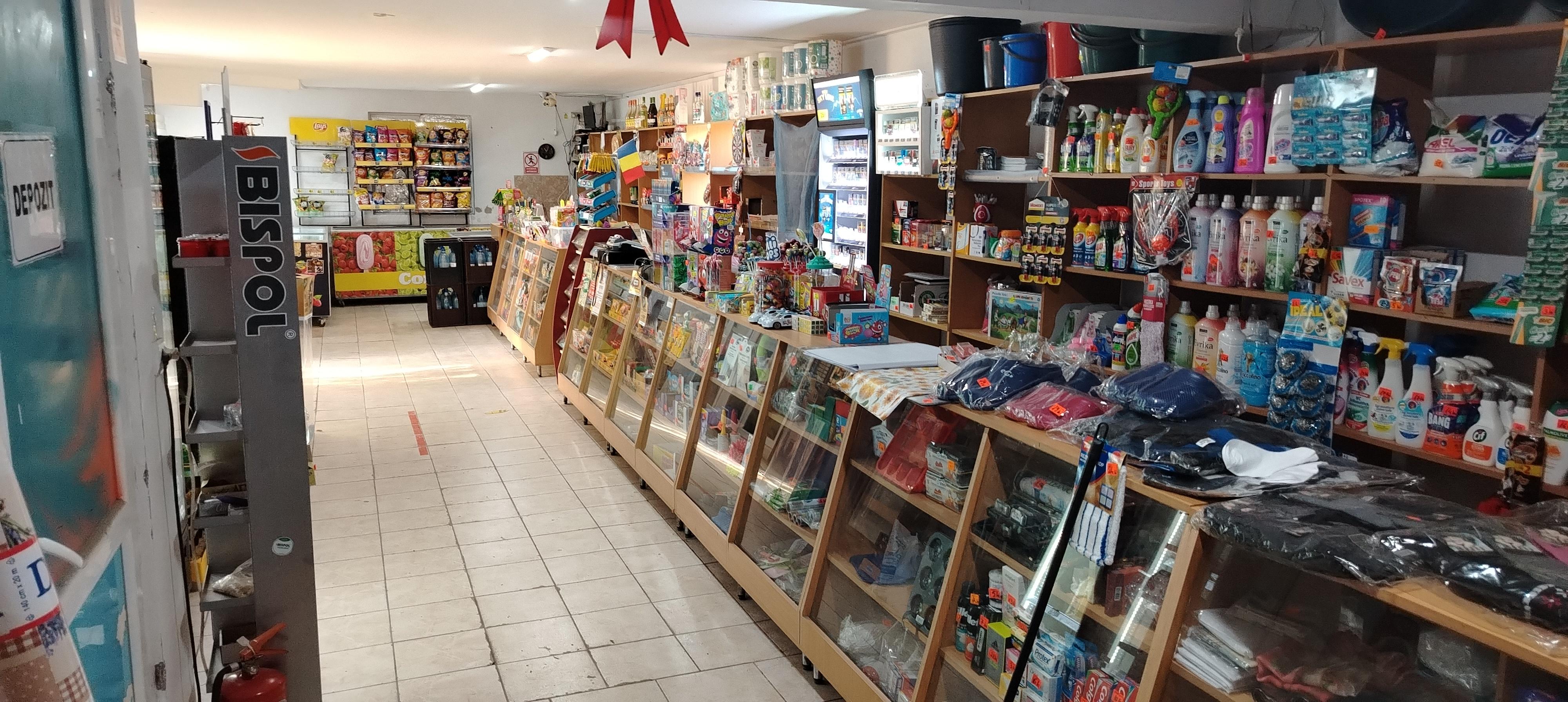 Spațiul comercial cu rafturi, vitrina pe perete are și un teren de 2000 de mp (25 x 80)
