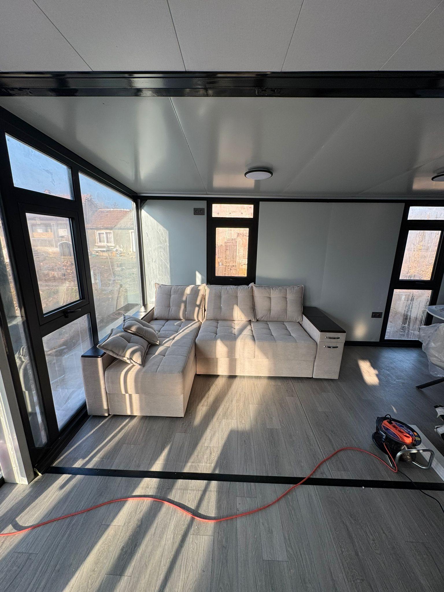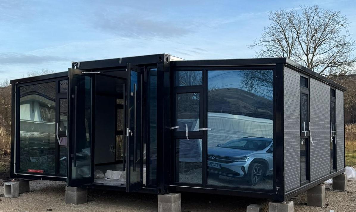 Suprafata - 38 mp, formata din dormitor, baie si living cu bucatarie open space. Are 2 pereti de sticla, usa sticla, baie completa, mobila de bucatarie, finisata interior si exterior, pereti exteriori de panou sandwishcu Rockwool,sitabla embosata caramida rosie la exterior, cadru metalic si geamuri albe.