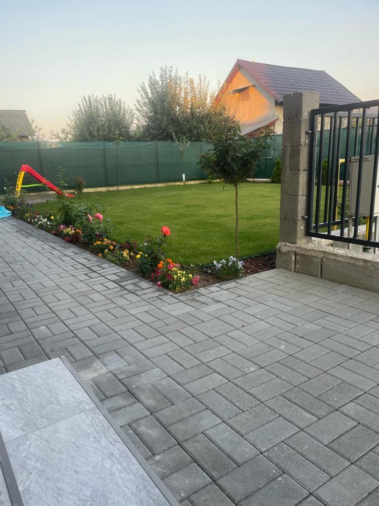 Exterior: pavaj împrejurul casei, zona verde cu gazon, loc de parcare mașinii cu posibilitatea de construcție a unei magazii (dacă se dorește)