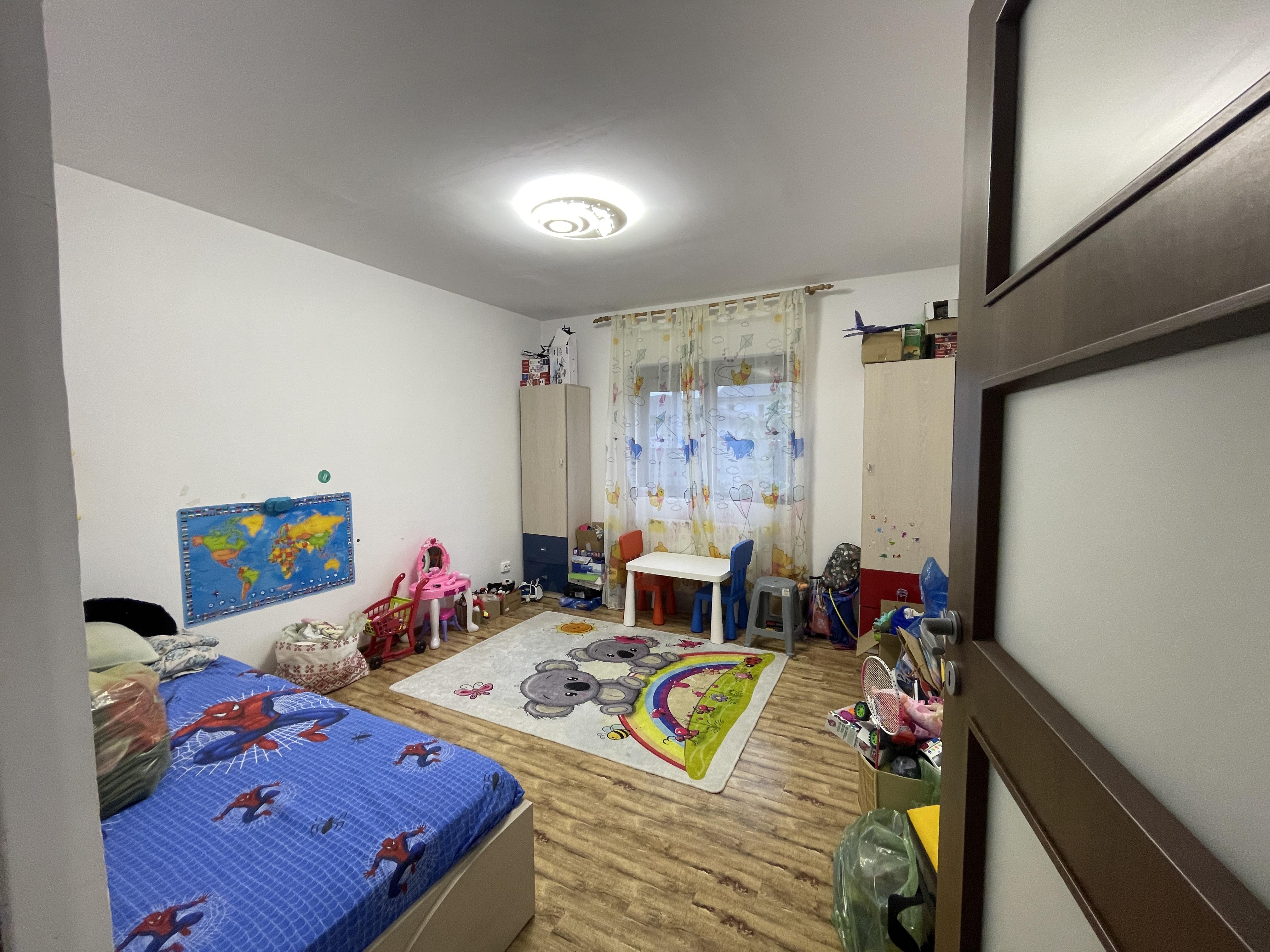 La etaj un dormitor si o baie cu dus, restul spatiului fiind folosit de noi ca loc de joaca si depozitare.