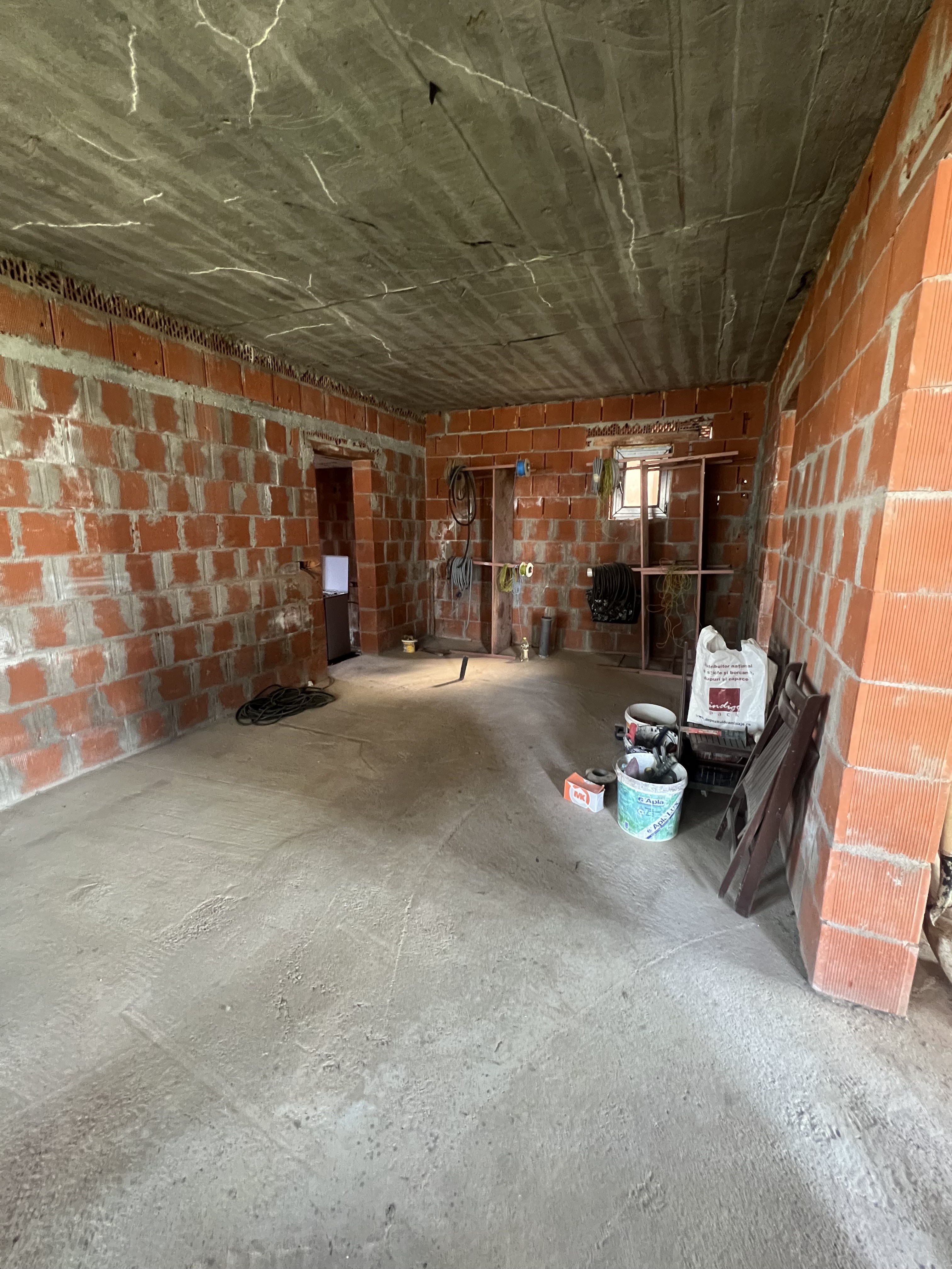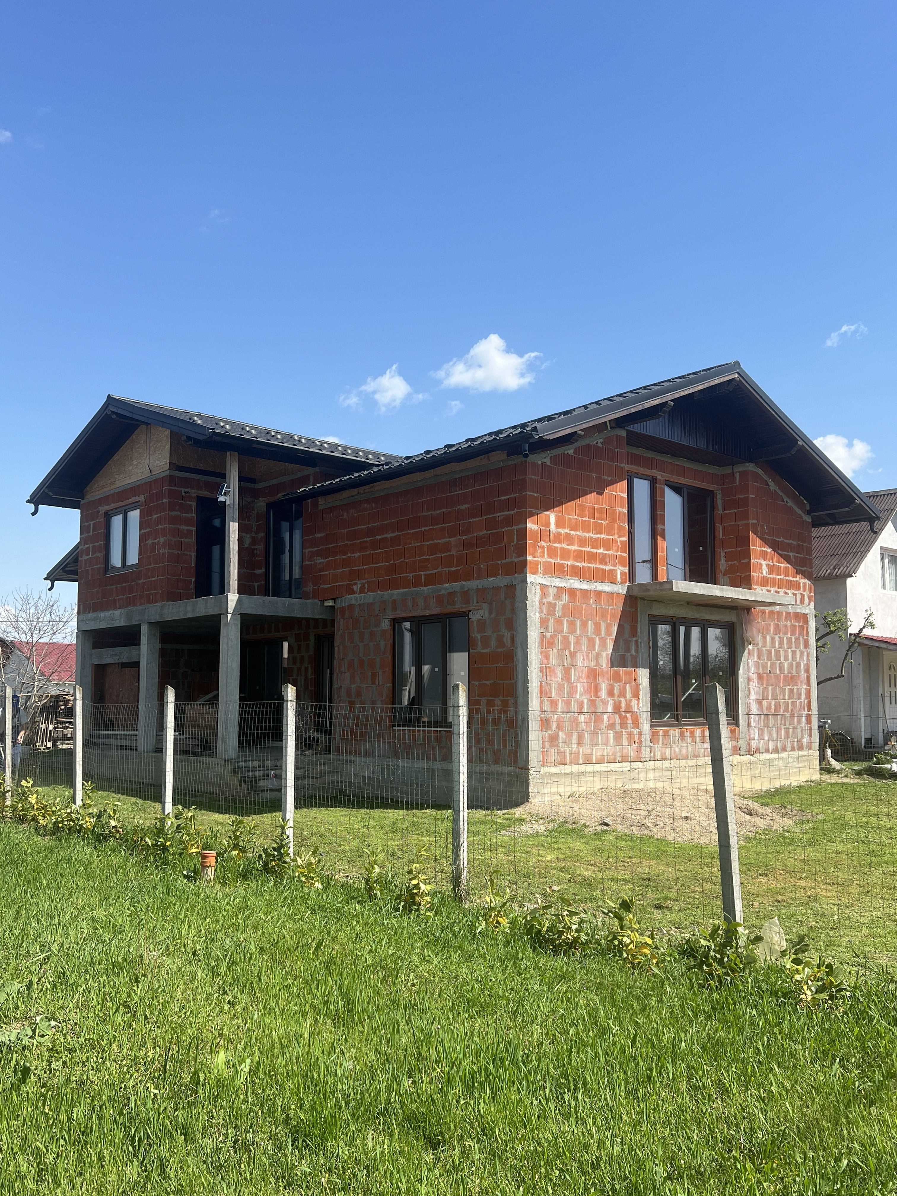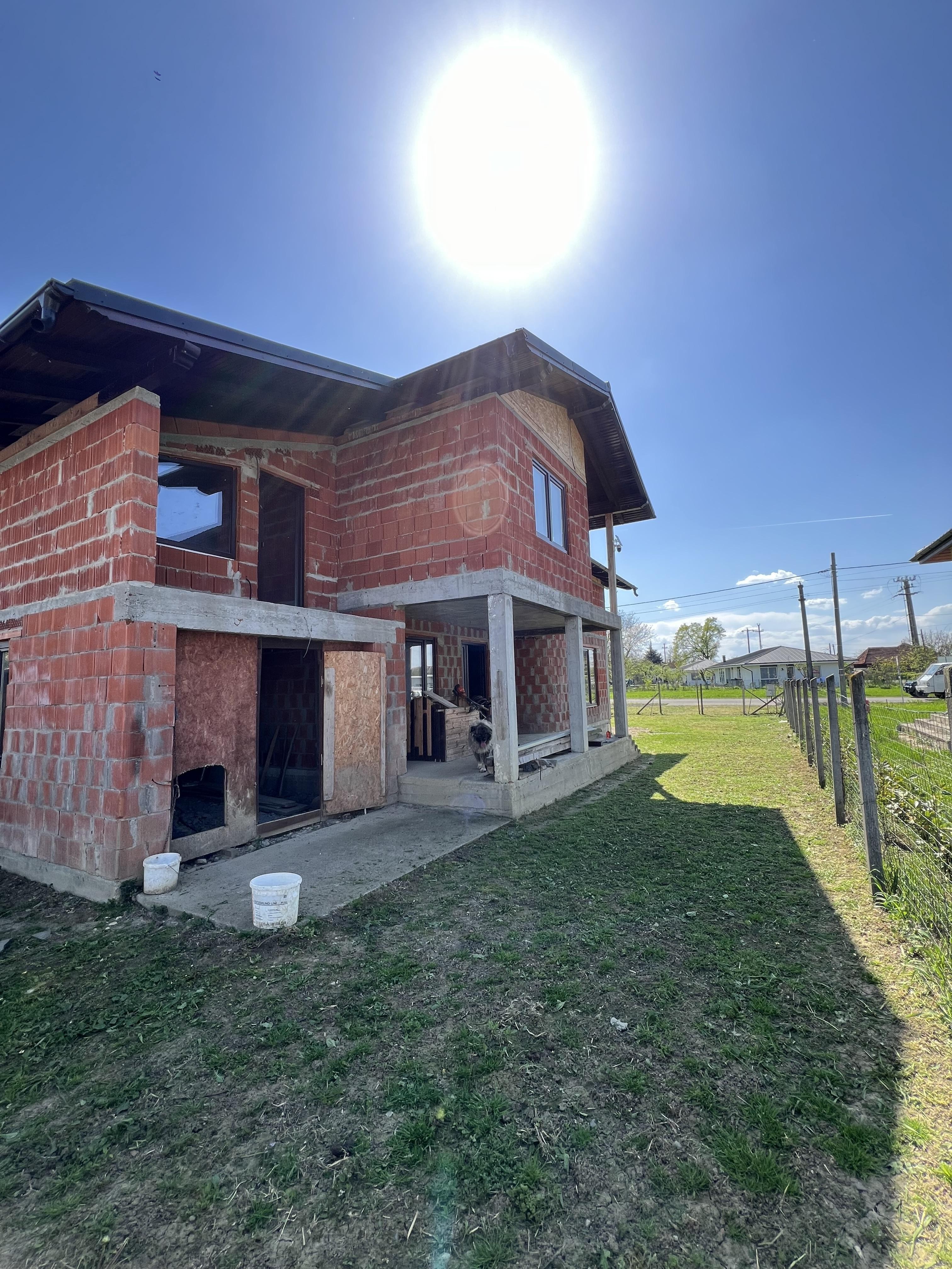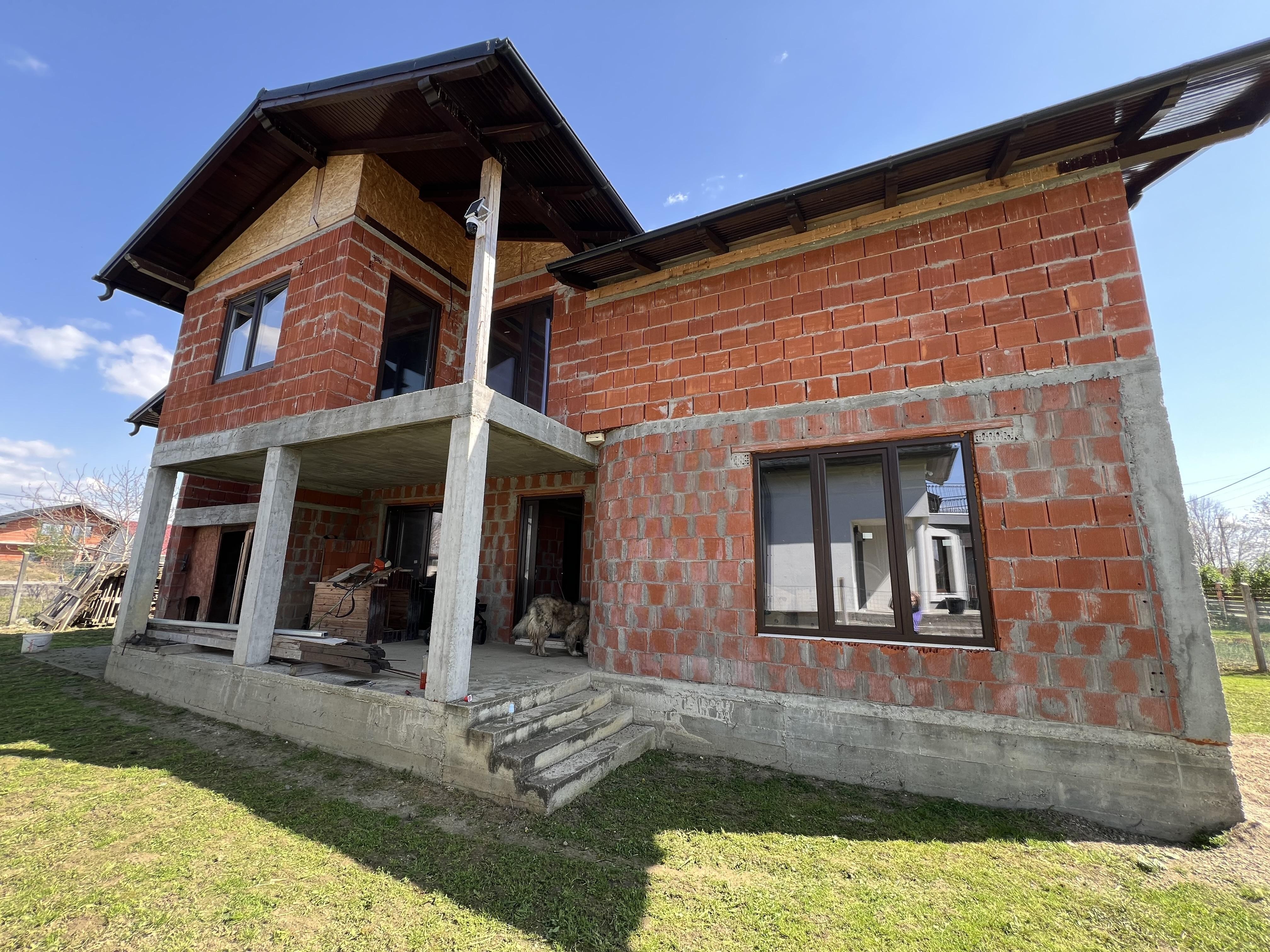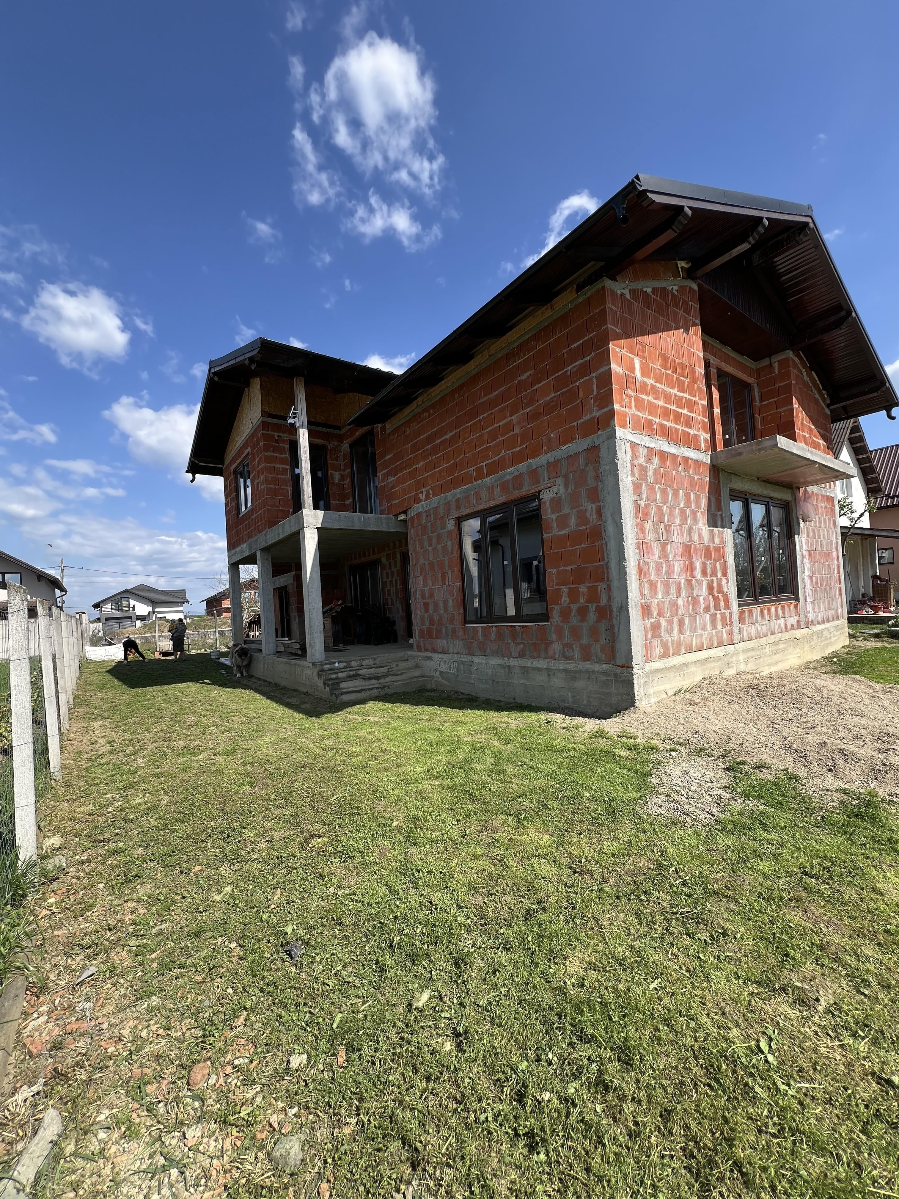 Casa are toate utilitatile pana in casa (gaz, curent, apa) instalatia electrica la etaj este finalizata, geamuri termopan, usa , tabla grande mat.