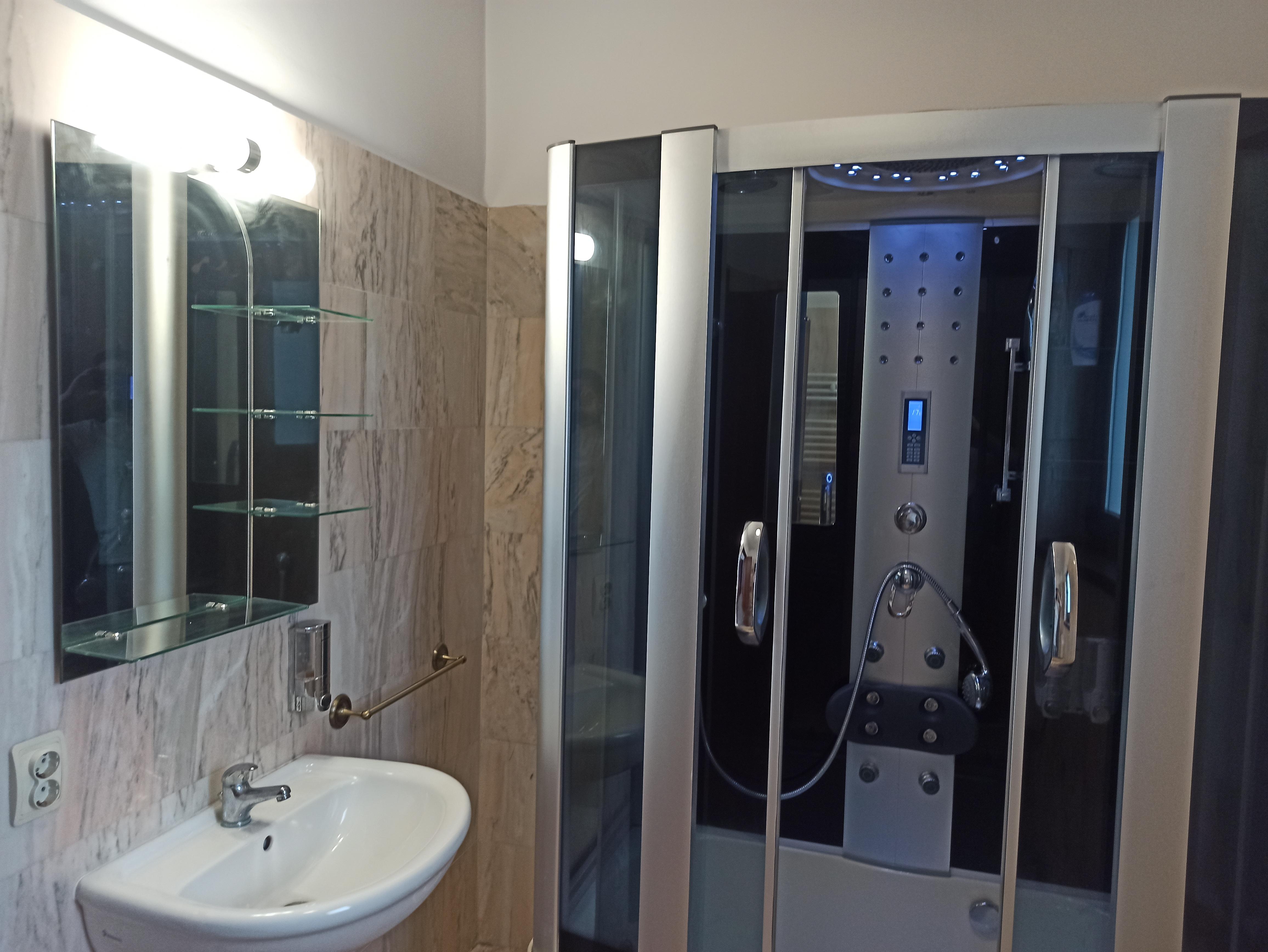Are 3 dormitoare sus și 2 bai dintre care un dormitor matrimonial cu baie proprie și cada tip jacuzzi cu radio,dressing și balcon spațios.
