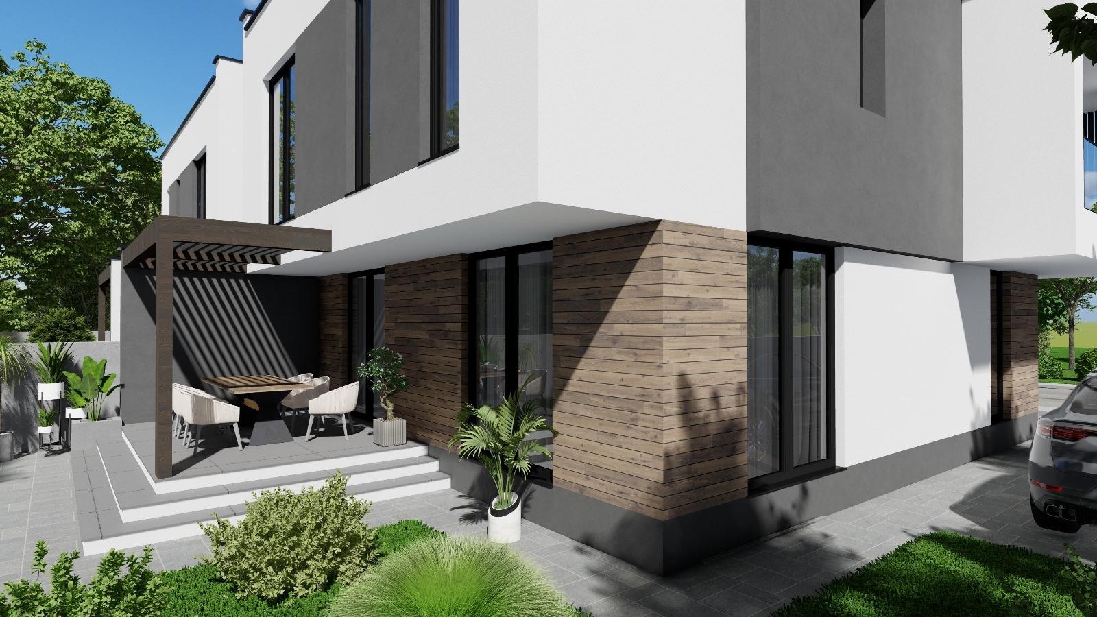 Proprietatile sunt edificate pe un teren de 259 mp si 309 mp , cu o suprafata construita de 203.79 mp. Curtea ofera doua locuri de parcare, terasa exterior și o zona verde amenajata cu gazon, plante ornamentale și pietre artizanale, inclusiv pavajul cu piatra travertin.