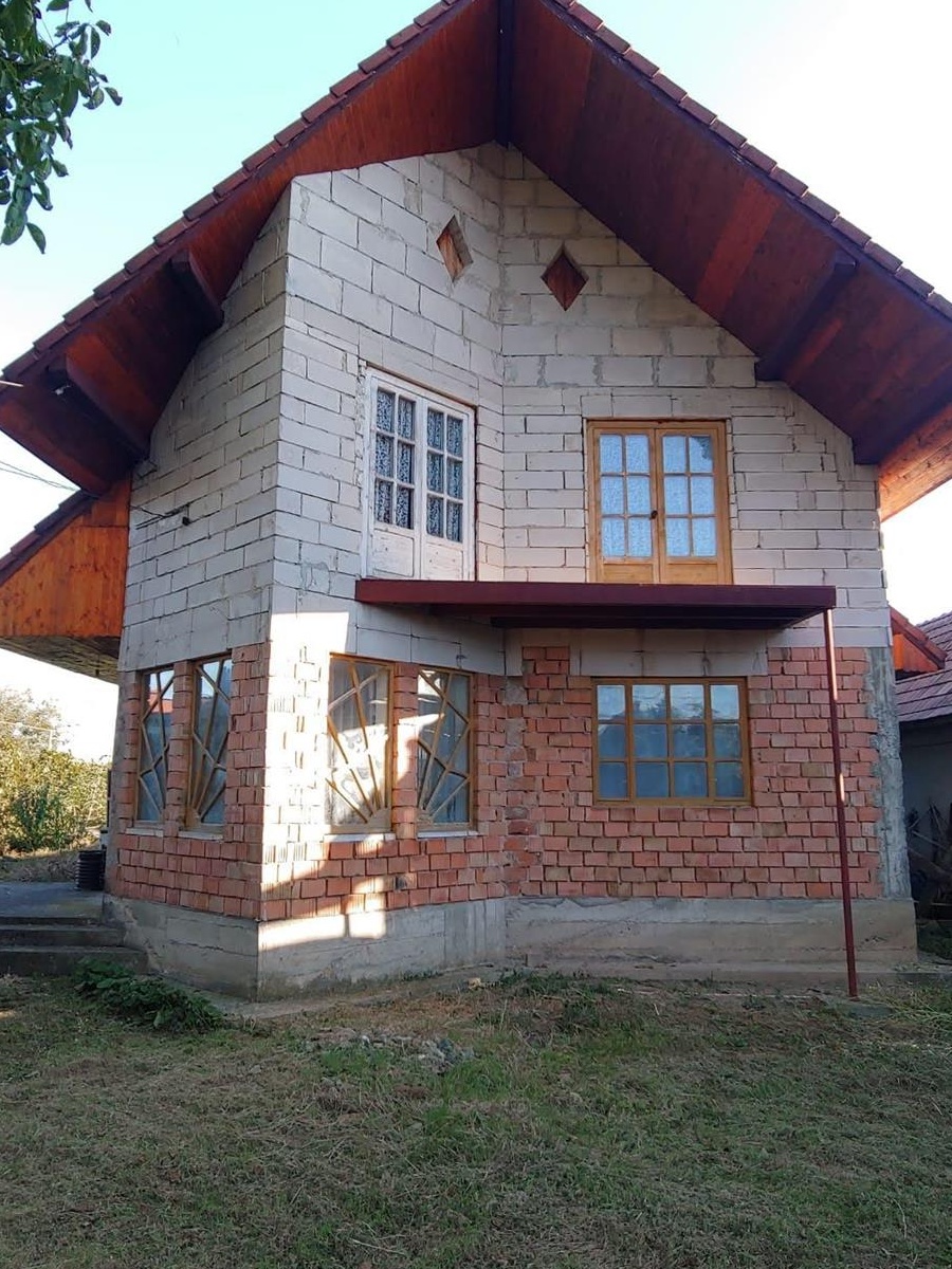 Date generale:Locatia: com. Mihai Viteazu, str. Principala 1167, jud. ClujSuprafata: Casa + gradina 2256mp Casa cu etaj: 223mp - subsol, parter, mansarda3 camere, 2 bai, bucatarie cu living mare, bucatarie de varaPret: 150.000negociabilCasa nu este complet terminata dar este locuibila. A fost finalizata, in stadiul in care este, in 2003. Are nevoie de finisari interior si exterior. Este partial mobilata si ambele bai sunt integrale. Lipseste mobila de bucataria, are doar aragaz si chuiveta. Geamurile trebuie inlocuite si usile trebuie imbunatatite. Scara interioara e doar provizorie.Incalzire cu centrala (calorifere existente).Bazin apa in pod cu pompa.Are fosa septica in partea din fata a proprietatii.La subsol exista o bucatarie de vara cu soba si chiuveta, plus 2 incaperi separate de pivnita. Pompa de apa este aici. In curte, in spatele casei, este fundatie pentru garaj si atelier.Puncte forte:Casa si proprietatea este cu actele si impozitele la zi. Locatia este foarte buna.Casa este de calitate: cu izolare, fara crepaturi, fundatie rezistenta.Design modern: arhitectura moderna, geamuri design modern, parchet lucrat manual cu model. Aproape si de oras dar si de munte (12min pana in Cheile Turzii)
